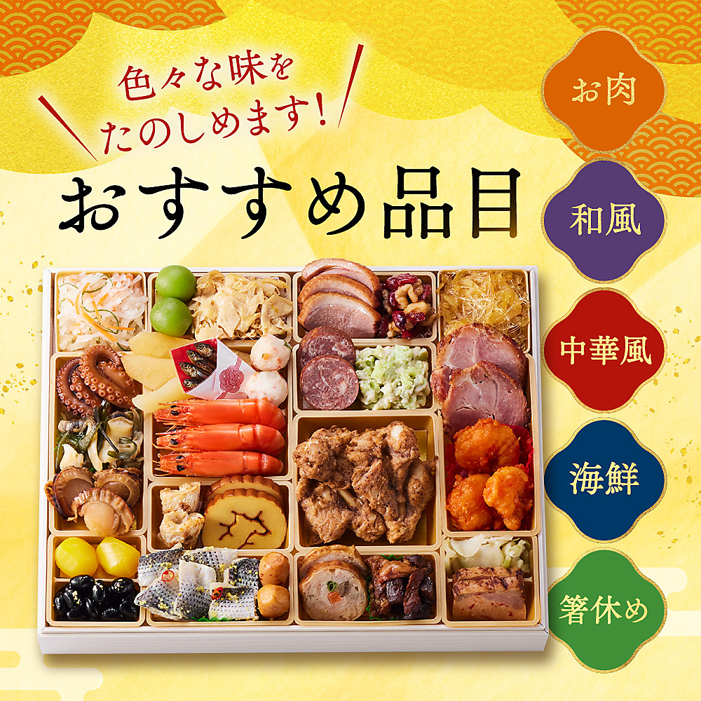 同ショップでおせち商品と他の商品をまとめて注文されますと、他の商品もおせち発送時期の対応になってしまいますので、ご注文は分けてご利用ください。