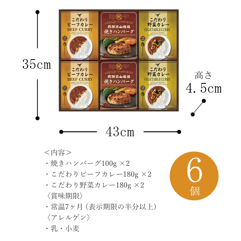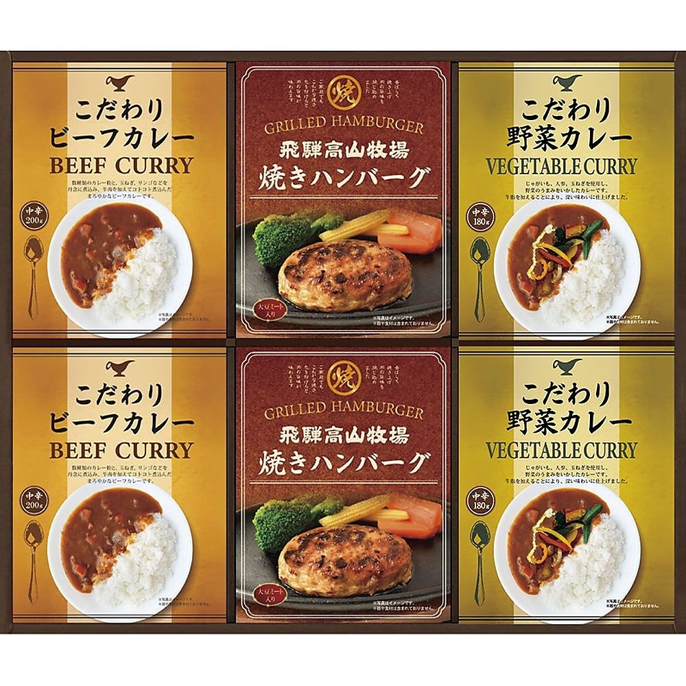 | 内容量 | こだわりカレー ビーフ・野菜 各180g ・焼きハンバーグ 100g ×各2 |