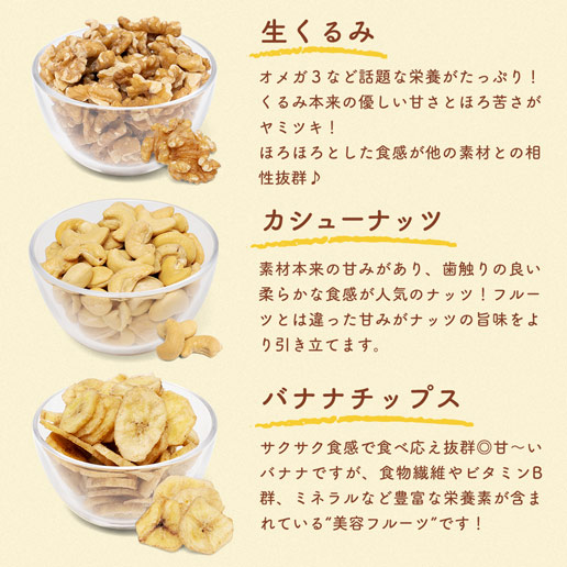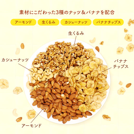 | 原産国・原産地 | アーモンド(アメリカ)、バナナチップ(バナナ、ココナッツオイル、砂糖)、くるみ、カシューナッツ |