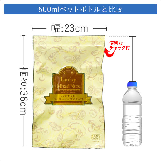 | 原材料/素材/材質 | アーモンド(アメリカ)、バナナチップ(バナナ、ココナッツオイル、砂糖)、くるみ、カシューナッツ |