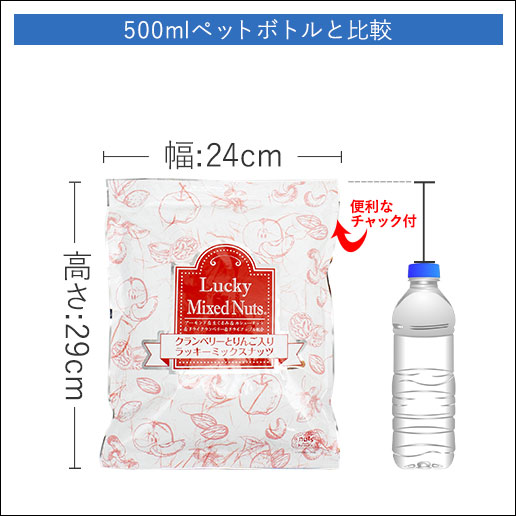 | 原材料/素材/材質 | アーモンド(アメリカ)、くるみ、ドライクランベリー(クランベリー、砂糖、植物油)、カシューナッツ、ドライアップル(りんご、砂糖)/酸味料、保存料(亜硫酸塩)、香料 |