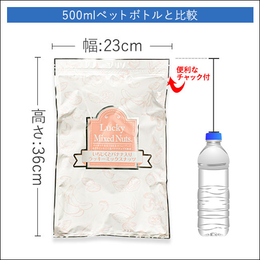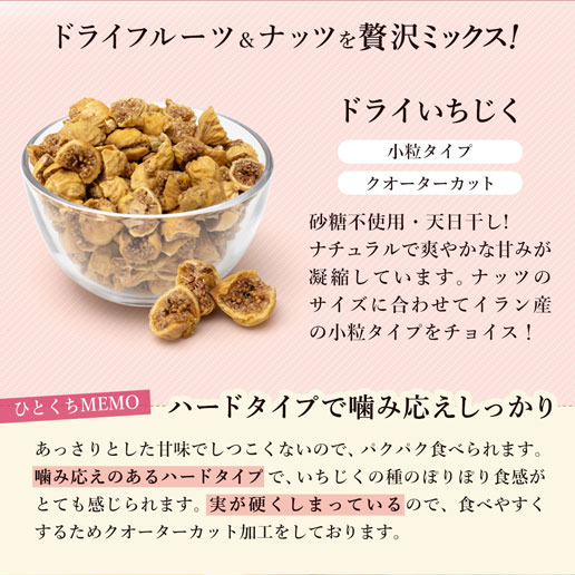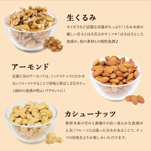 | 原産国・原産地 | イチジク(イラン)、くるみ、スクエアバナナチップス(バナナ、ココナッツオイル、砂糖)、アーモンド、カシューナッツ |