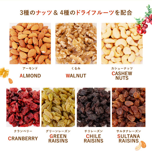 | 原材料/素材/材質 | くるみ(アメリカ)、アーモンド、カシューナッツ、ドライクランベリー(クランベリー、砂糖、植物油)、サルタナレーズン(レーズン、植物油)、チリレーズン(レーズン、植物油)、グリーンレーズン |
