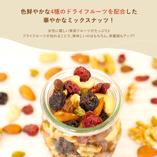 | 原産国・原産地 | くるみ(アメリカ)、アーモンド、カシューナッツ、ドライクランベリー(クランベリー、砂糖、植物油)、サルタナレーズン(レーズン、植物油)、チリレーズン(レーズン、植物油)、グリーンレーズン |