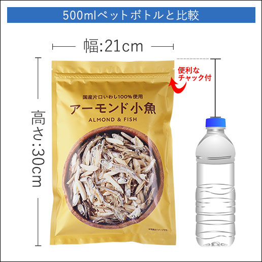 | 原産国・原産地 | 片口いわし(国産)、アーモンド(アメリカ産)、砂糖、麦芽糖、胡麻、水飴、食塩/調味料(アミノ酸) |