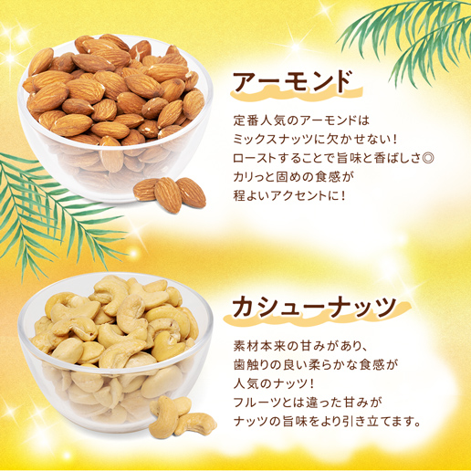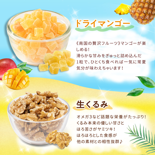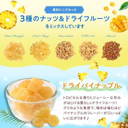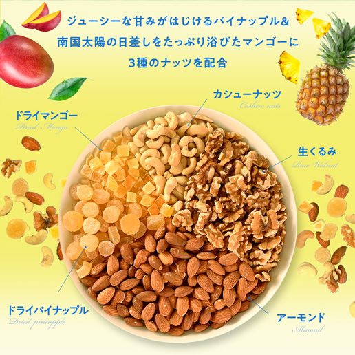 | 原産国・原産地 | アーモンド(アメリカ)、くるみ、ドライパイナップル(パイナップル、砂糖)、カシューナッツ、ドライマンゴー(マンゴー、砂糖)/香料、酸味料、保存料(亜硫酸塩) |