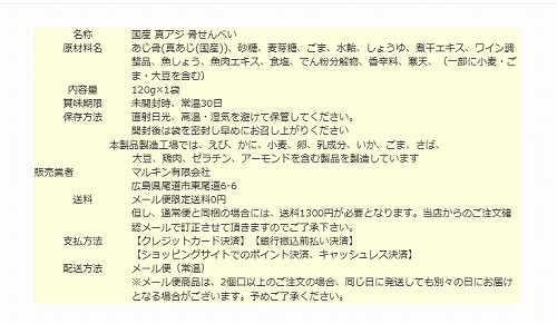 | 原材料/素材/材質 | あじ骨(真あじ(国産))、砂糖、麦芽糖、ごま、水飴、しょうゆ、煮干エキス、ワイン調整品、魚しょう、魚肉エキス、食塩、でん粉分解物、香辛料、寒天、(一部に小麦・ごま・大豆を含む) |
