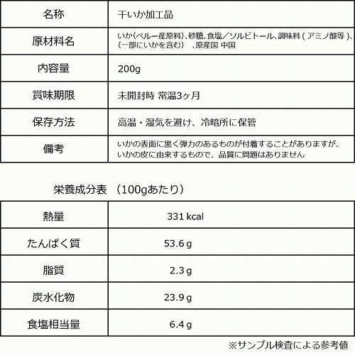 | 原材料/素材/材質 | いか(ペルー産)、砂糖、食塩/ソルビトール、調味料(アミノ酸等)、(一部にいかを含む) 、原産国 中国 |