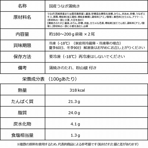 | 原材料/素材/材質 | うなぎ(宮崎県産または鹿児島県産)、醤油、砂糖混合異性化液糖、みりん、水あめ、砂糖、うなぎエキス、酒精、増粘剤(加工澱粉、増粘多糖類)、調味料(アミノ酸等)、着色料(カラメル、アナトー)、(原材料の一部に小麦、大豆を含む) 【うなぎのタレ】醤油、みりん、砂糖、水飴、カラメル色素、増粘剤(加工でん粉)、調味料(アミノ酸等)、(原材料の一部に小麦を含む)、山椒 |