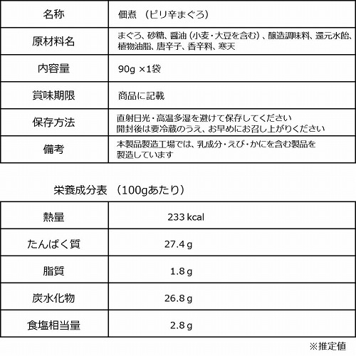 | 原材料/素材/材質 | まぐろ、砂糖、醤油、醸造調味料、還元水飴、植物油脂、唐辛子、香辛料、寒天 |