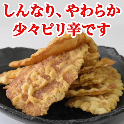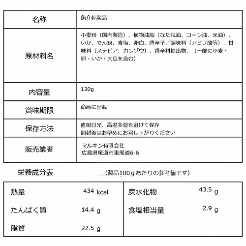 | 原材料/素材/材質 | 小麦粉(国内製造)、植物油脂(なたね油、コーン油、米油)、いか、でん粉、食塩、卵白、唐辛子/調味料(アミノ酸等)、甘味料(ステビア、カンゾウ)、香辛料抽出物、(一部に小麦・卵・いか・大豆を含む) |
