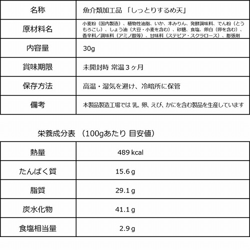 | 原材料/素材/材質 | 小麦粉、植物油脂、いか、本みりん、発酵調味料、でん粉(とうもろこし)、醤油(大豆・小麦を含む)、砂糖、食塩、卵白、香辛料、調味料(アミノ酸等)、甘味料(ステビア・スクラロース)、膨張剤 |