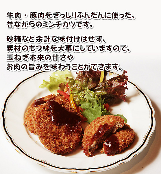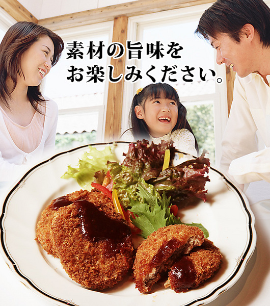 | 原材料/素材/材質 | 牛肉(オーストラリア)、豚肉(カナダ・チリ)、玉葱、脱脂大豆、醤油、食塩、衣(パン粉、澱粉、食塩、香辛料、食物繊維、酵母エキス) (原料の一部に乳、小麦、大豆を含む) |