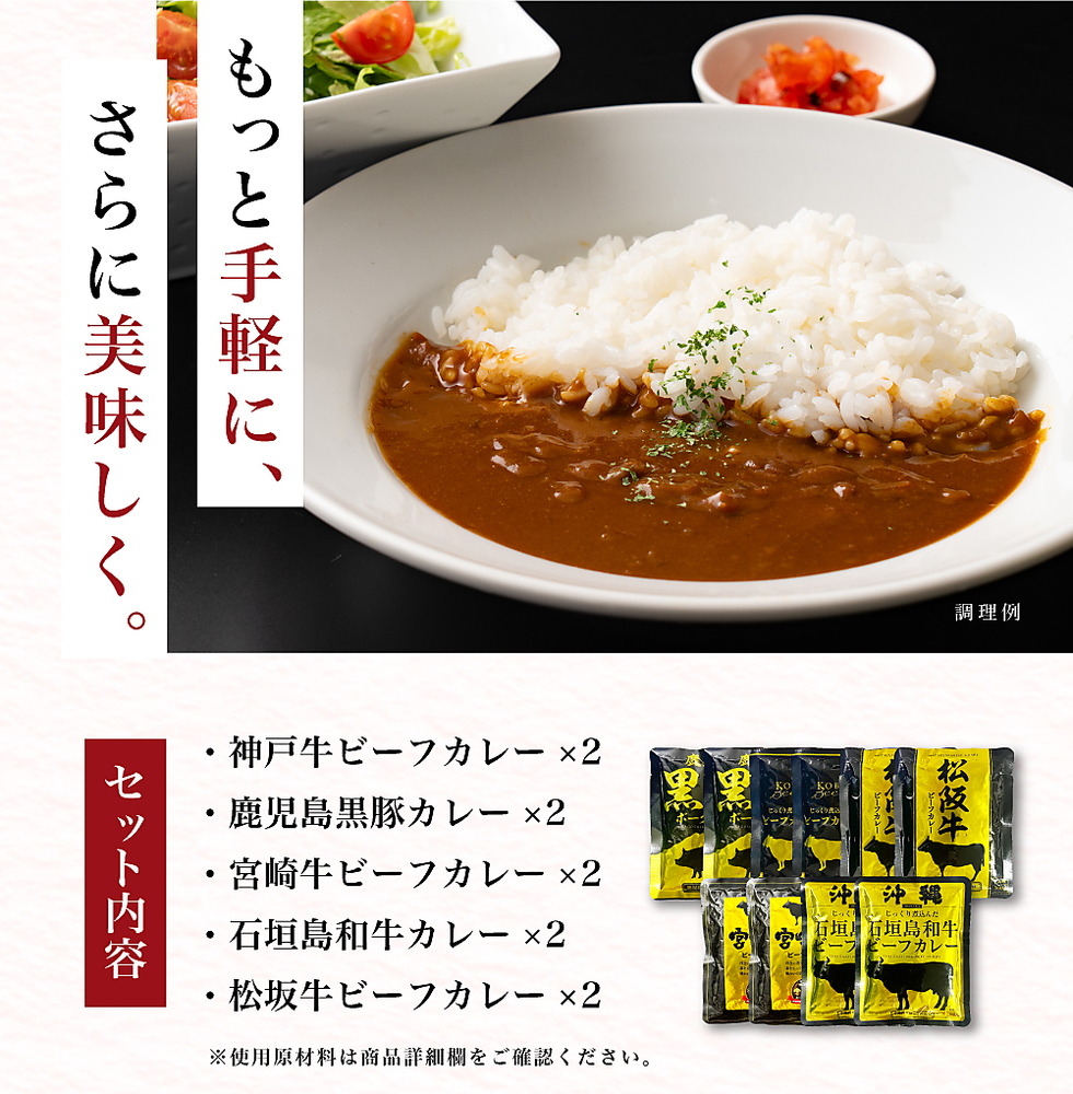 | 内容量 | 松阪牛ビーフカレー 一人前(160g)×2袋 宮崎牛ビーフカレー 一人前(160g)×2袋 神戸牛ビーフカレー 一人前(160g)×2袋 沖縄石垣島和牛ビーフカレー 一人前(160g)×2袋 鹿児島黒豚ポークカレー 一人前(160g)×2袋 |
