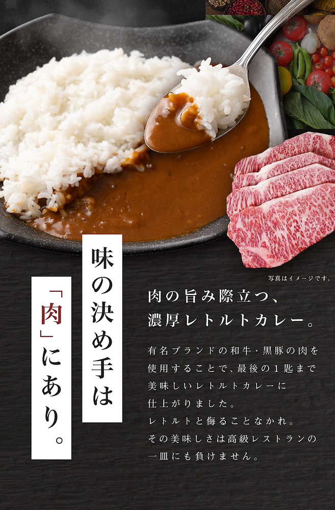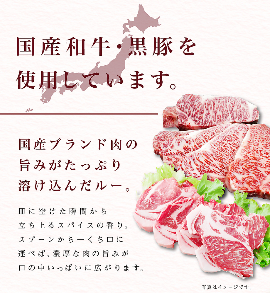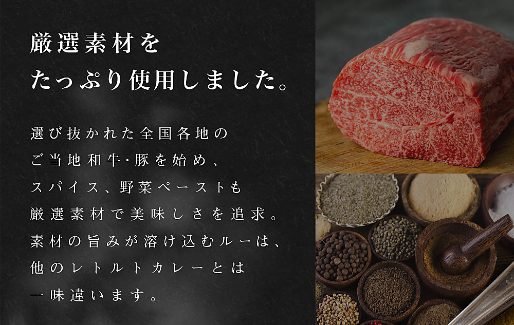 | 原材料/素材/材質 | 【共通】野菜(玉ねぎ(国産)、人参)、豚脂、小麦粉、砂糖、果実ペースト(マンゴー、りんご)、食塩、カレー粉、トマトペースト、ビーフエキス(小麦・大豆を含む)、トマトピューレ、チャツネ(りんごを含む)、大豆たん白、食用植物油脂(大豆を含む)、野菜ペースト(生姜、にんにく)、香辛料、オニオンパウダー、還元水あめ、酵母エキス、ガーリックパウダー(大豆を含む)/着色料(カラメル、ココア)、増粘剤(加工でん粉)、調味料(アミノ酸等:小麦・大豆由来)、乳化剤、酸味料、香料 【松阪牛ビーフカレー】牛肉(三重県産) 【宮崎黒毛和牛ビーフカレー】牛肉(宮崎県産) 【神戸牛ビーフカレー】牛肉(兵庫県産) 【沖縄 石垣島和牛ビーフカレー】牛肉(沖縄県産) 【鹿児島黒豚ポークカレー】豚肉(鹿児島県産) |