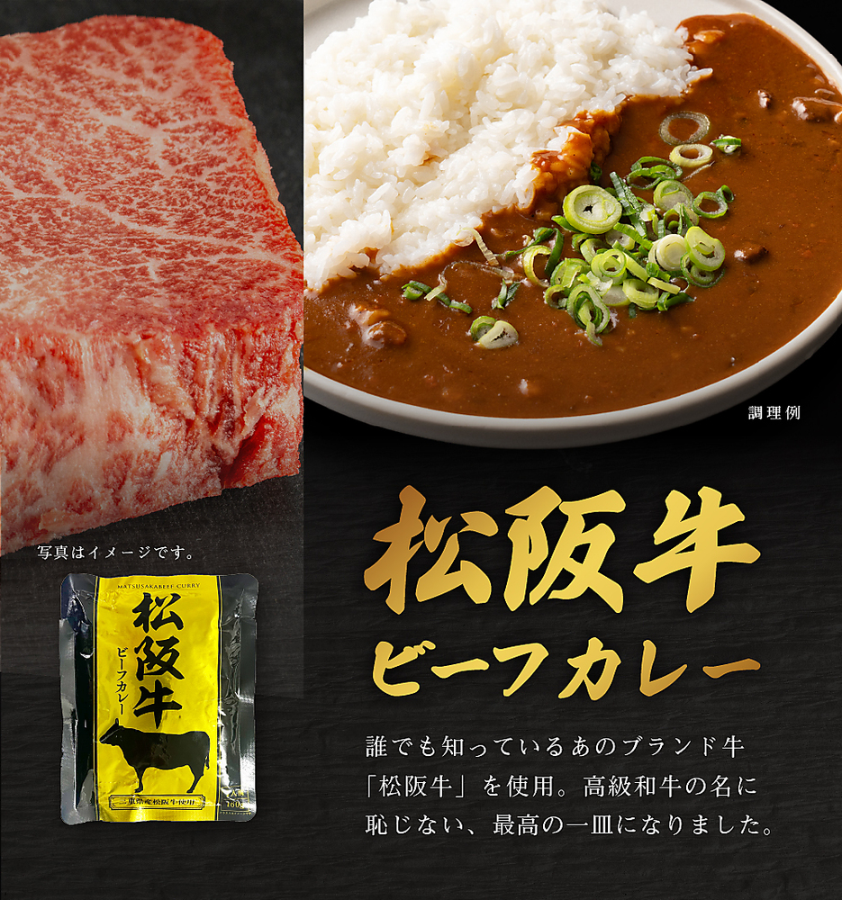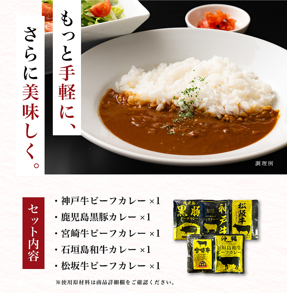 | 内容量 | 松阪牛ビーフカレー 一人前(160g)×1袋 宮崎牛ビーフカレー 一人前(160g)×1袋 神戸牛ビーフカレー 一人前(160g)×1袋 沖縄石垣島和牛ビーフカレー 一人前(160g)×1袋 鹿児島黒豚ポークカレー 一人前(160g)×1袋 |