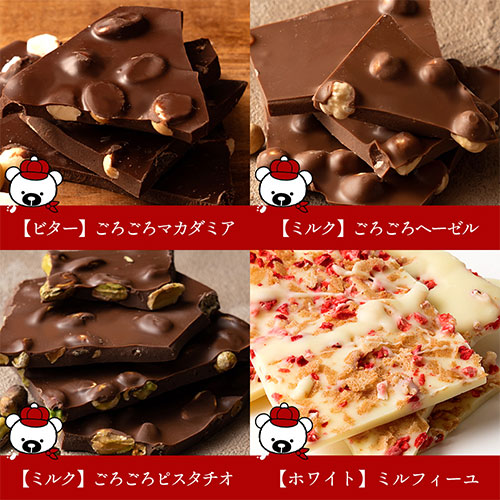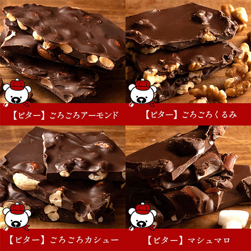 | 原材料/素材/材質 | 砂糖(外国製造)、ココアバター、カカオマス、全粉乳、乳糖、アーモンド、カシューナッツ、マカデミアナッツ、くるみ、ピスタチオ、ヘーゼルナッツ、水あめ、 クランベリー、いちご、小麦粉、抹茶、ブルーベリー、ショートニング、ココアパウダー、ゼラチン、ライスパフ、コーンスターチ、果糖ブドウ糖液糖、植物油、ブドウ糖果糖液糖、ホエイパウダー、 食塩、大豆たんぱく、バター、脱脂粉乳、モルトエキス、/乳化剤、香料、着色料(ビートレッド)、酸味料、膨張剤、(一部に乳成分・アーモンド・カシューナッツ・くるみ・小麦・大豆・ゼラチンを含む) |