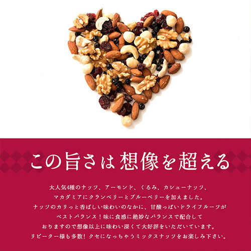 | 原産国・原産地 | 生クルミ:中国産またはアメリカ産 マカダミアナッツ:マラウイ・ケニア カシューナッツ:ベトナム ワイルドブルーベリー:アメリカ クランベリー:アメリカ |