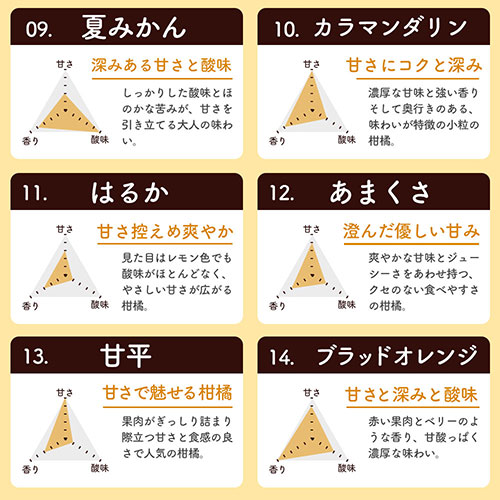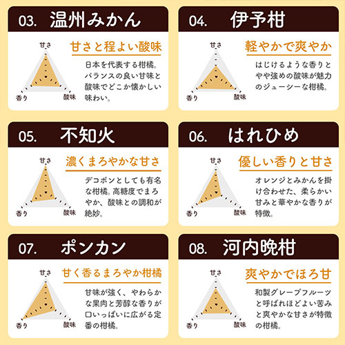 | 原産国・原産地 | せとか(国産)、清見(国産)、温州みかん(国産)、伊予柑(国産)、不知火(国産)、はれひめ(国産)、ポンカン(国産)、河内晩柑(国産)、夏みかん(国産)、カラマンダリン(国産)、はるか(国産)、あまくさ(国産)、甘平(国産)、ブラッドオレンジ(国産) |