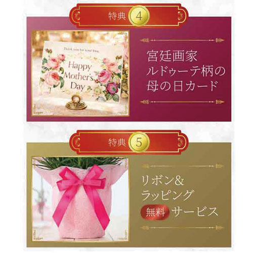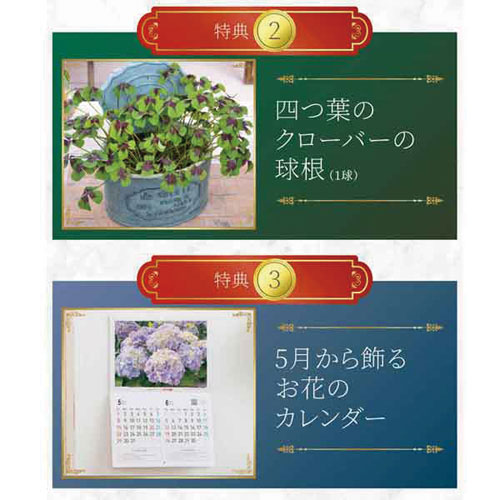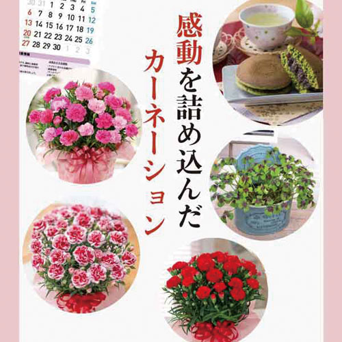 | 内容量 | カーネーション5号鉢×1、四つ葉のクローバー球根(1球)×1、5月からはじまるお花のカレンダー×1、母の日カード(栽培説明書付き)×1、抹茶どら焼き(約80g)1個×1 |