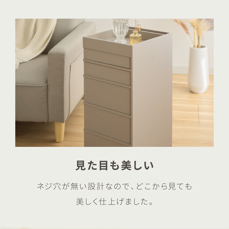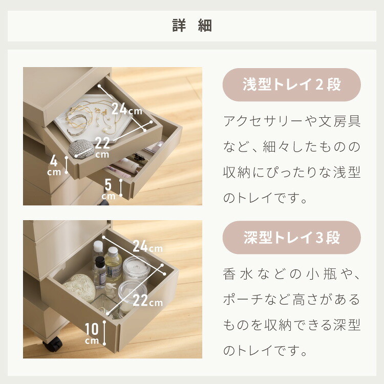 上段3段は浅く細かい物を収納できるスライド引き出し、下段3段は深くたっぷり収納できる引き出しとなっております。
