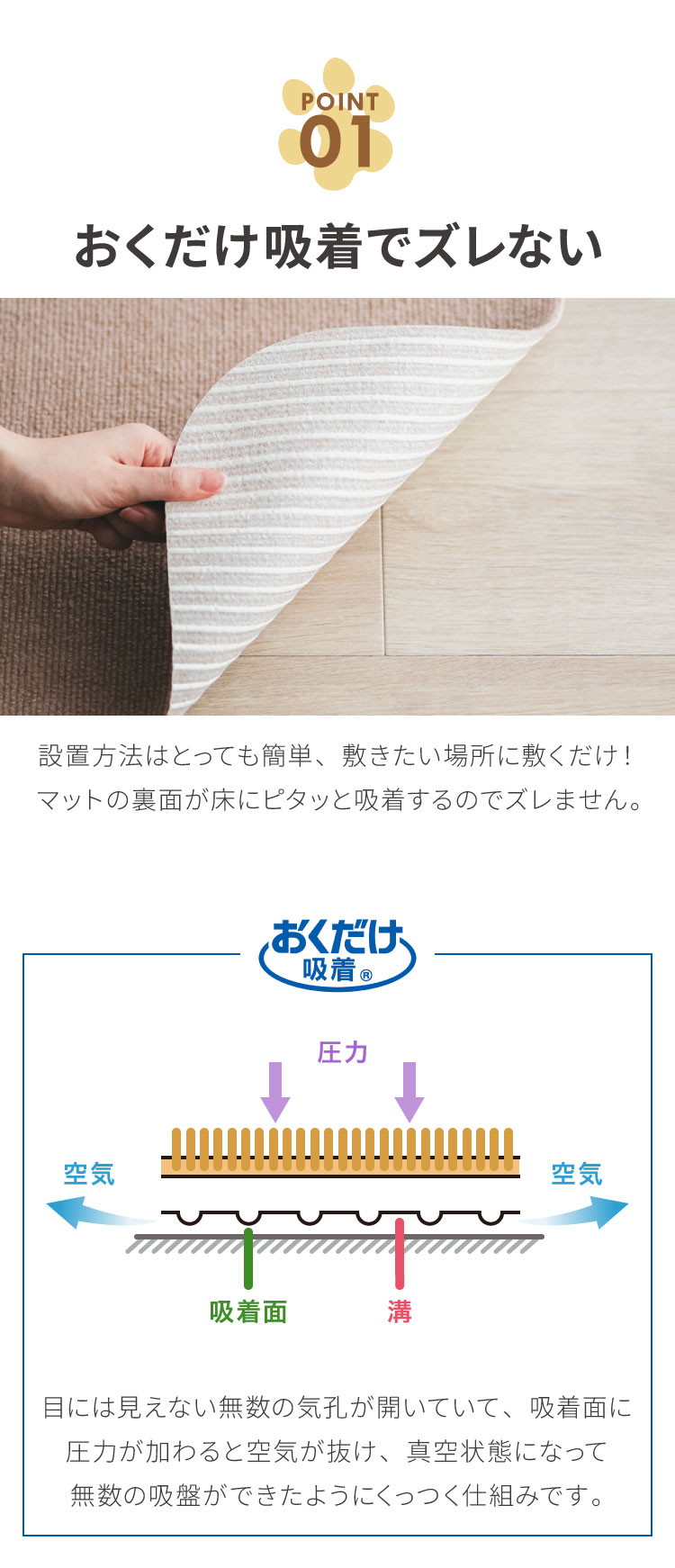 ・マットの裏面が床にピタッと吸着するのでズレません。