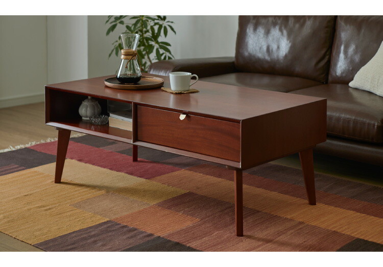 引き出しとオープン収納スペースが付いた便利なリビングテーブルです。