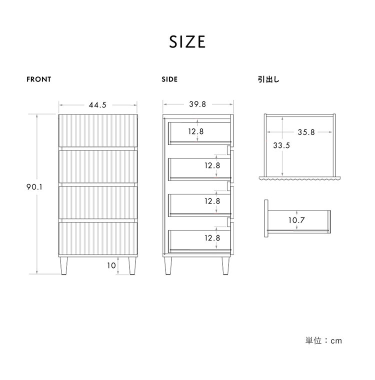 *商品サイズ:本体サイズ:W44.5×D39.8×H90.1(cm)、引き出し内寸:W35.8×D33.5×H10.7(cm)、脚元空間:H10(cm)