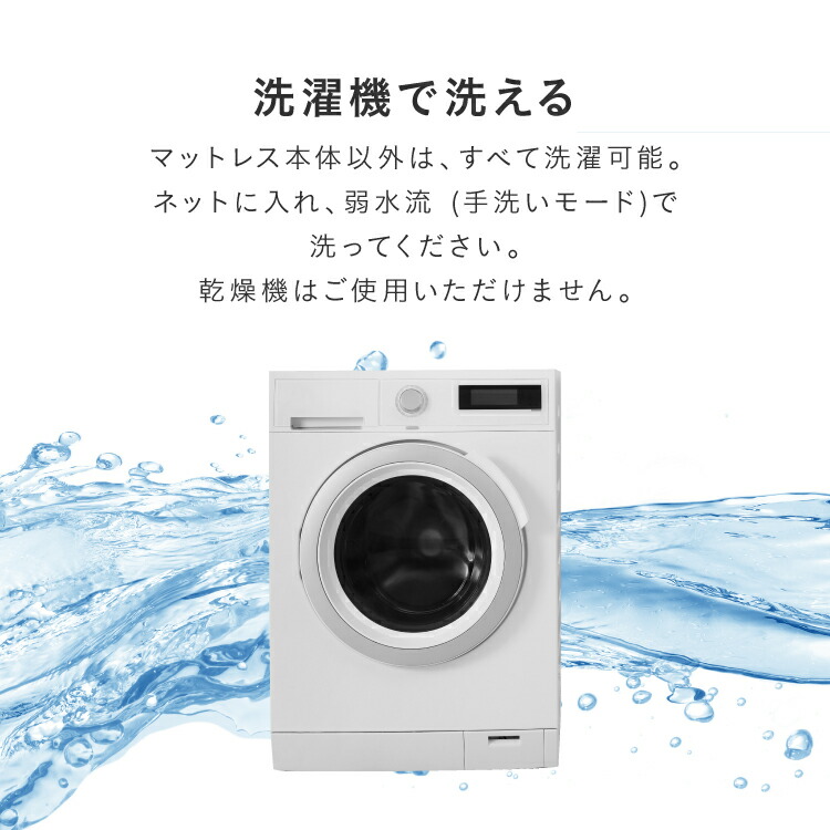 洗濯機で洗える。マットレス本体以外はすべて洗濯可能。ネットに入れ弱流水(手洗いモード)で洗って下さい。