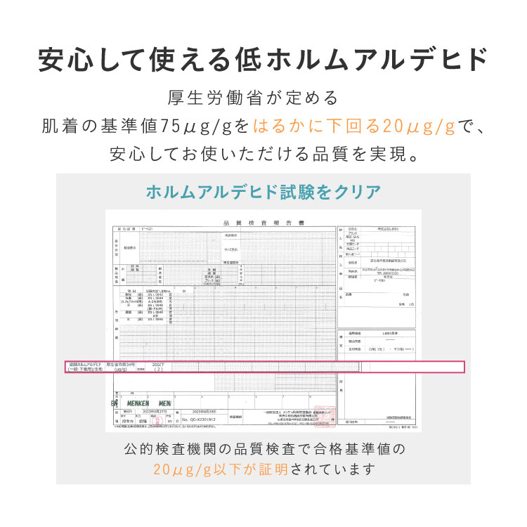 二層構造生地でほこりが出にくい。生地の擦れ・ヘたりから中綿やほこりが出にくいよう中綿と側生地の間に不織布を加えた二層構造生地を採用しました。