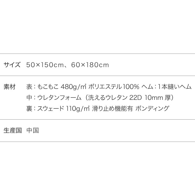 | 原材料/素材/材質 | 表:もこもこ 480g/平方メートル ポリエステル100% ヘム:1本縫いヘム 中材:ウレタンフォーム(洗えるウレタン22D 10mm厚) 裏面:スウェード110g/平方メートル 滑り止め機能有 ボンディング |