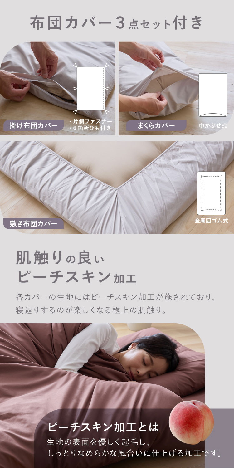 2枚の掛け布団を季節に合わせて使い分けわたの光が異なる2枚の掛け布団を使い分けることで、暖かさを調節し、すべての季節に対応することのできる掛け布団です。