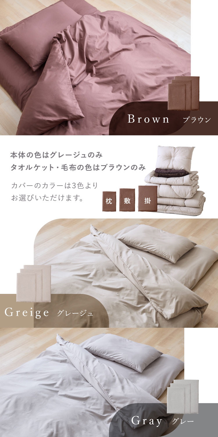 布団10点セット タオルケット 毛布付き シングル 洗える 2枚合わせ 肌掛け布団 合掛け布団 敷布団 3層構造 ブラウン