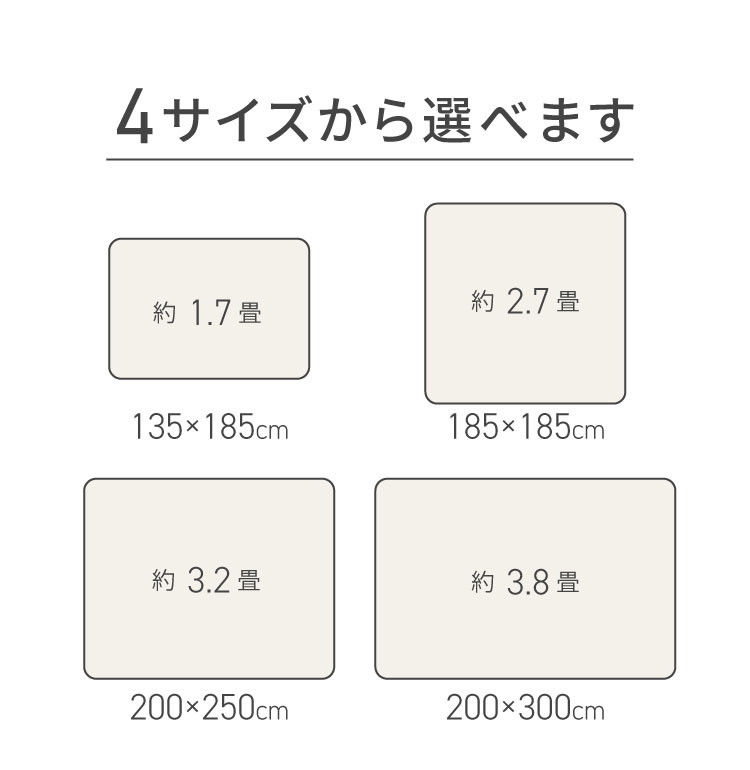 135×185cm(約1.7畳)/185×185cm(約2.7畳)/200×250cm(約3.2畳)/200×300cm(約3.8畳)