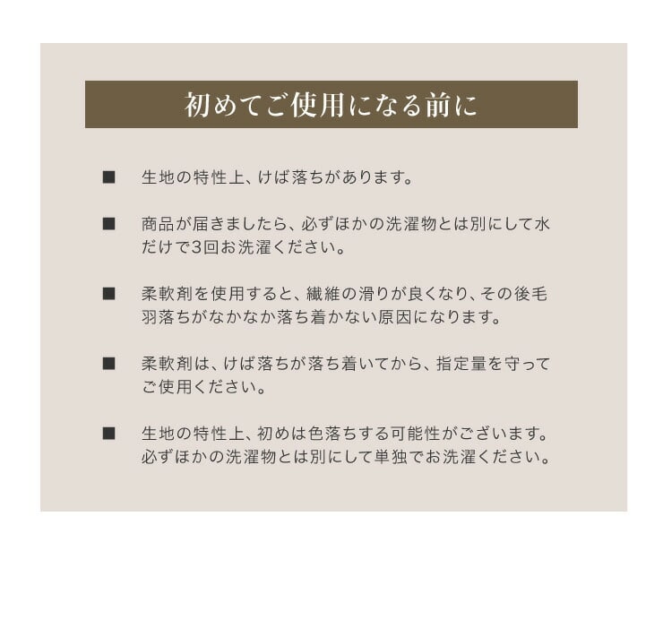 商品が届きましたら、必ずほかの洗濯物とは別にして水だけで3回お洗濯ください。