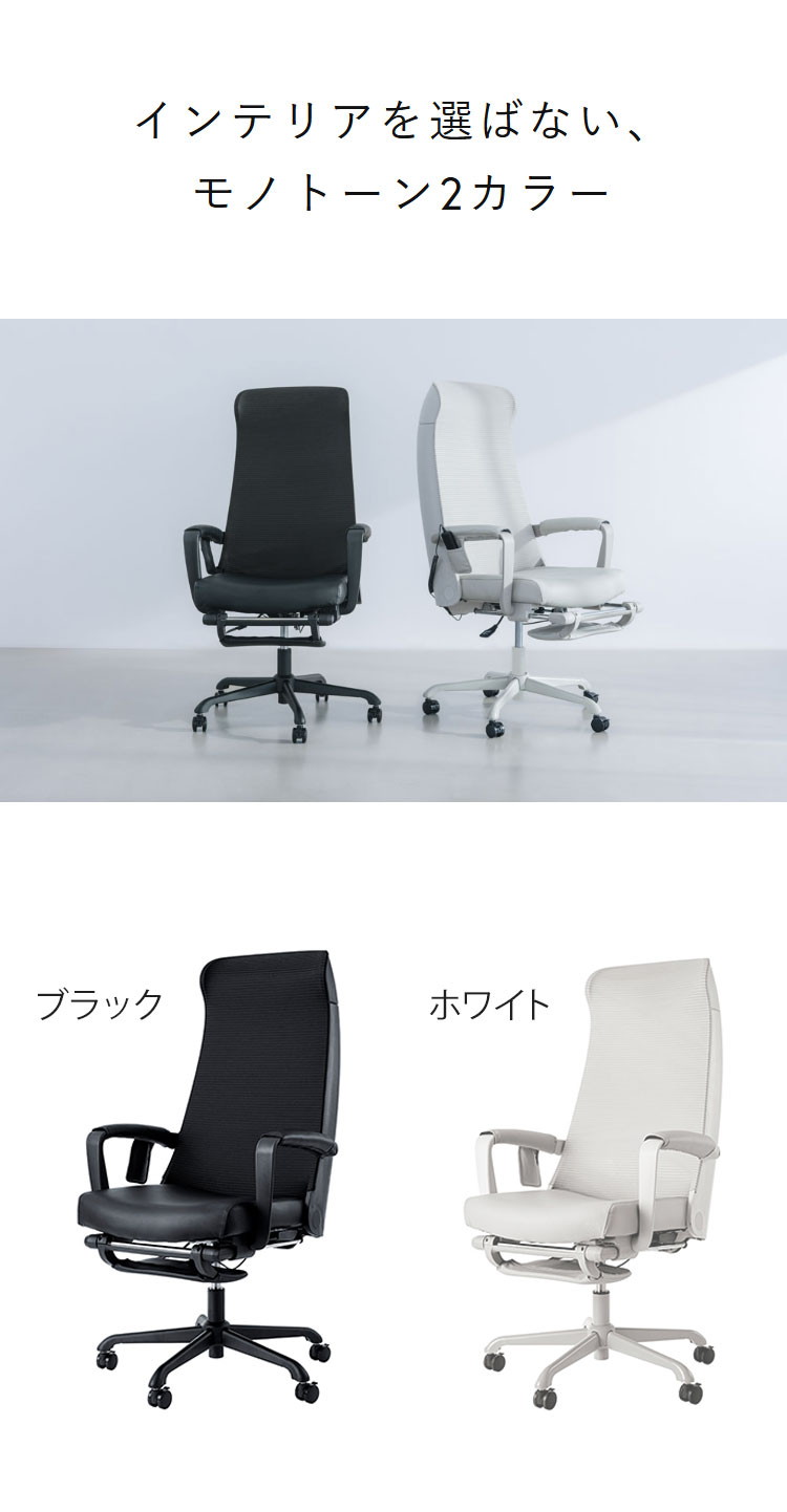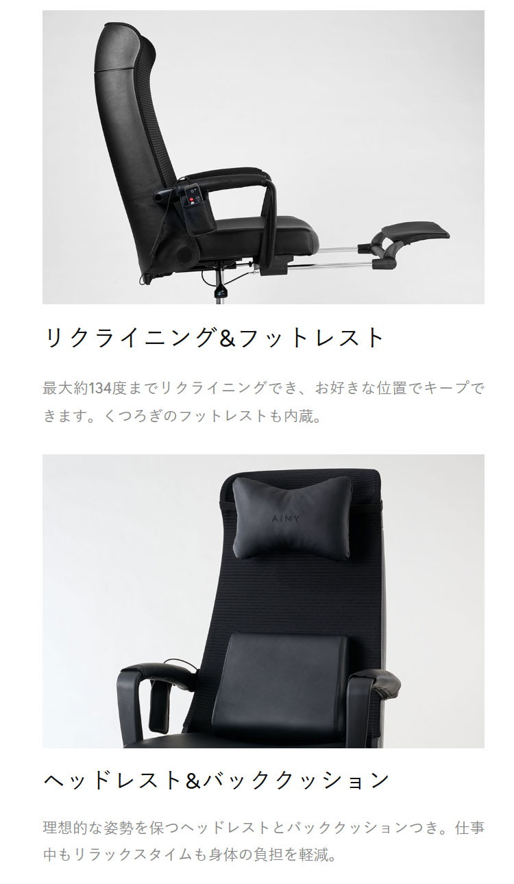 理想的な姿勢を保つヘッドレストとバッククッションつき。仕事中もリラックスタイムも身体の負担を軽減。