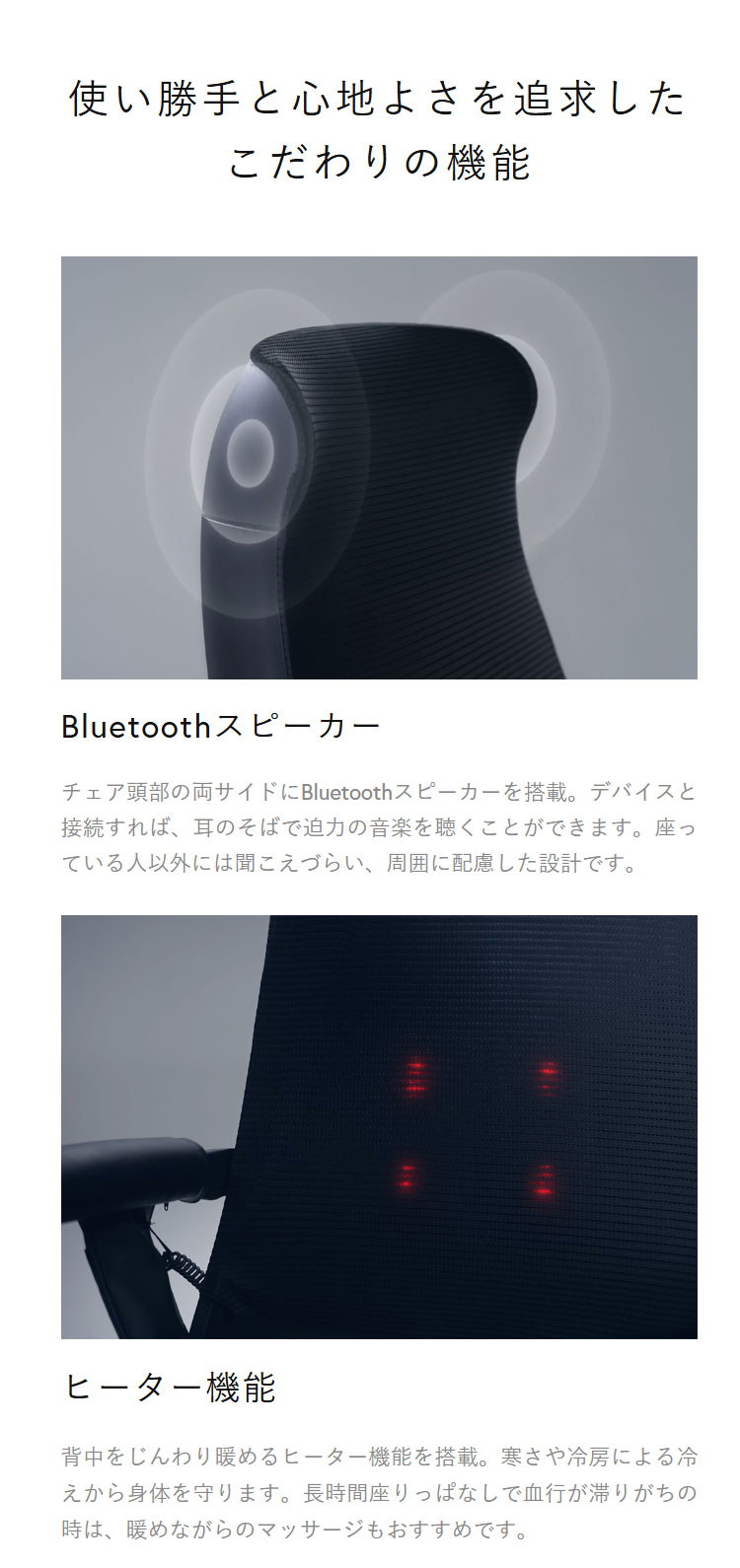 チェア頭部の両サイドにBluetoothスピーカーを搭載。デバイスと接続すれば、耳のそばで迫力の音楽を聴くことができます。座っている人以外には聞こえづらい、周囲に配慮した設計です。