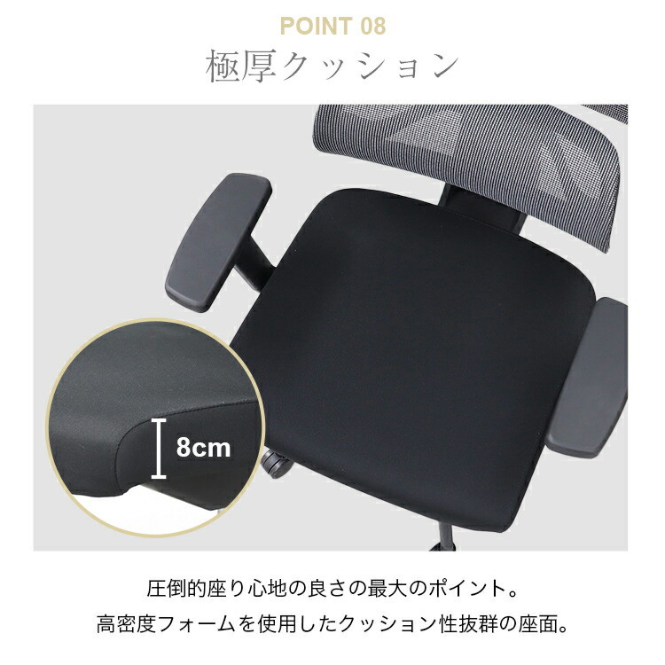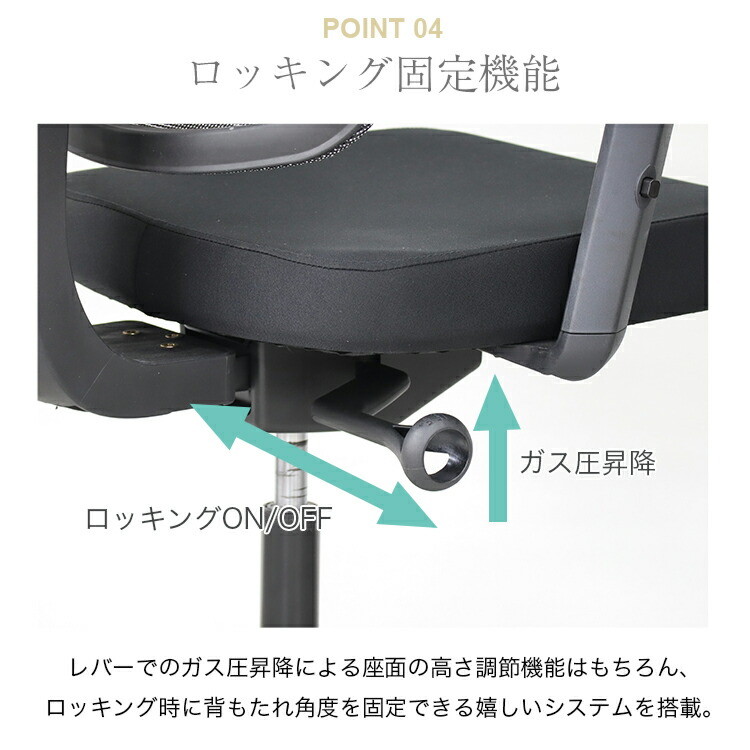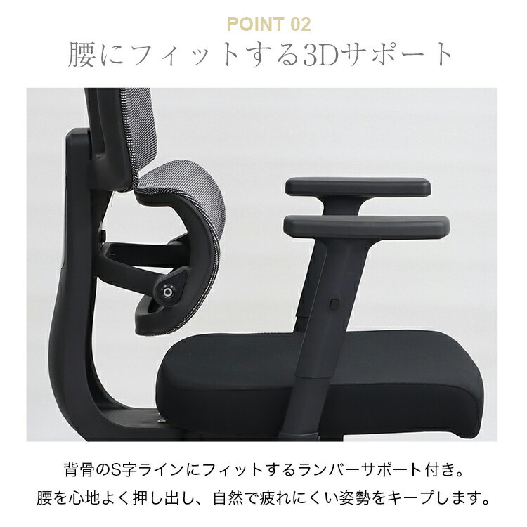 腰のS字ラインに合わせたランバーサポート付きで、長時間のデスクワークも理想的な姿勢を保ちます。