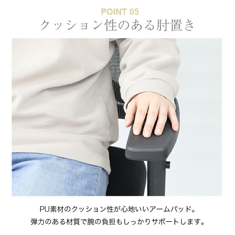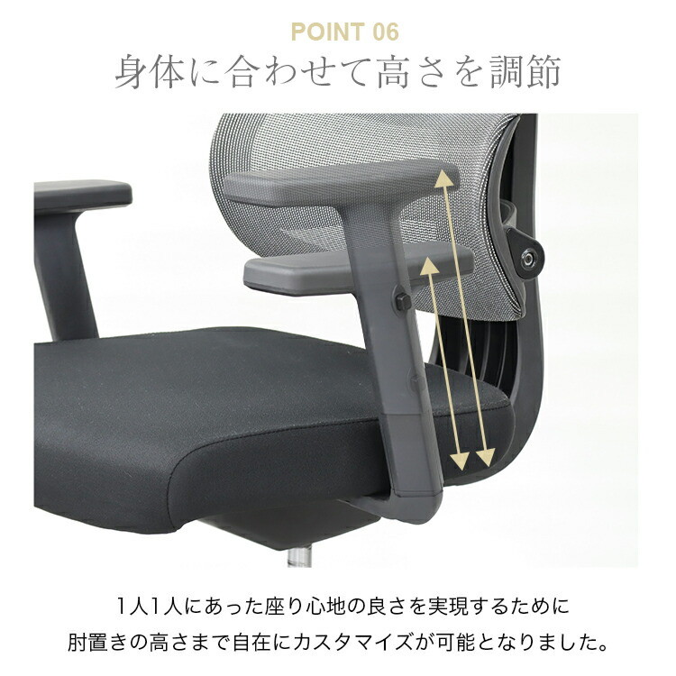 座面の高さ調節のほかに可動式ヘッドレストや肘置きの高さ調節も可能なので、身体に合わせた座り心地を体感できます。