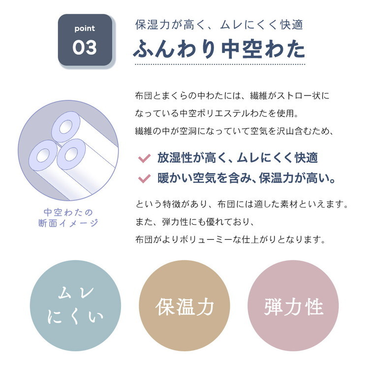 またダニの発生を抑制する効果も高く「抗菌・防臭・防ダニ」のトリプル効果がある高機能わたです!衛生的で、お子様にも安心。中芯には厚みのあるぽこぽことした凹凸があるプロファイル加工を施したウレタンフォームを使用しています。