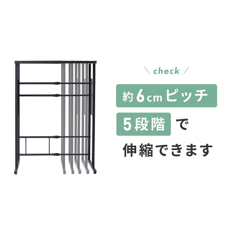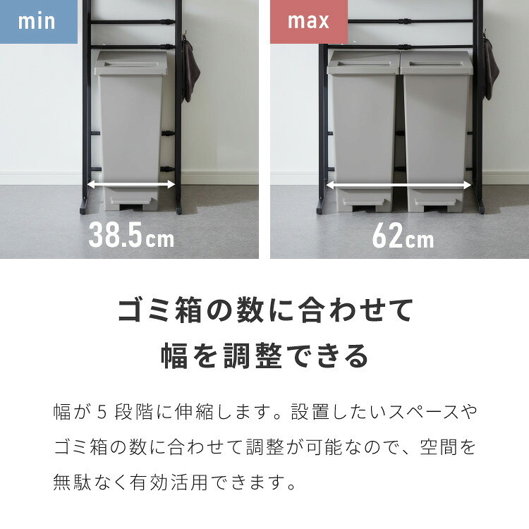 幅が5段階(38.5cm~62cm)に伸縮するので、キッチン周りの限られたスペースに設置できます。
