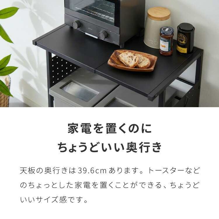 奥行はスリムな39.6cm設計で、トースターなどちょっとしたキッチン家電を置くこともできます。