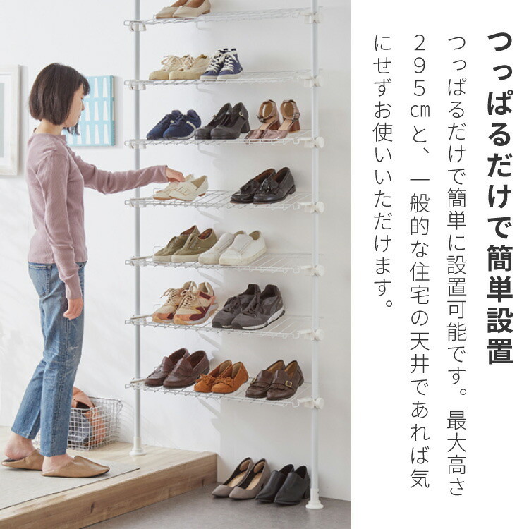 突っ張り シューズラック 8段 スリム 省スペース 棚自由自在 下駄箱 スリム 玄関収納 薄型 靴 靴箱 靴ラック ホワイト