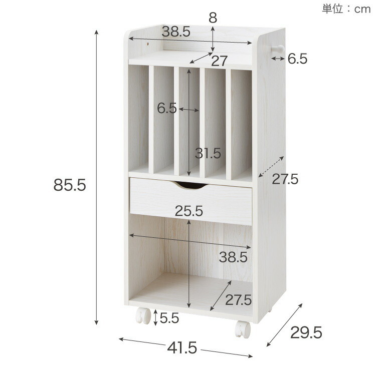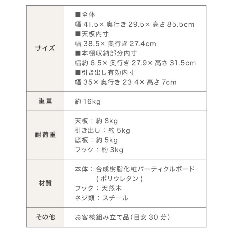 | サイズ/寸法 | 幅41.5×奥行き29.5×高さ85.5cm 天板内寸:幅38.5×奥行き27.4cm 本棚収納部分内寸:幅約6.5×奥行き27.9×高さ31.5cm 引き出し有効内寸:幅35×奥行き23.4×高さ7cm |