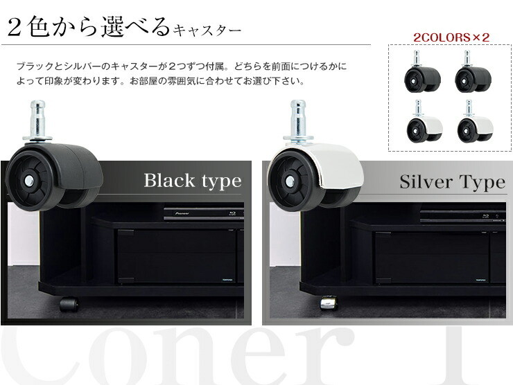 キャスターはシルバー、ブラックが2個づつ入っていますので前面にお好みの色を選択可能。