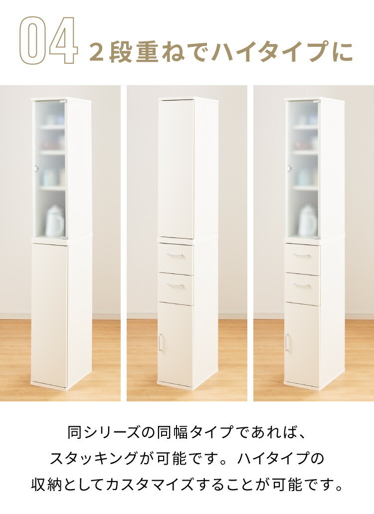 スレンダーシリーズ同サイズのストッカー、キャビネット、シェルフ、チェストと組み合わせも可能。(チェストは下部設置のみ)可動棚3枚。