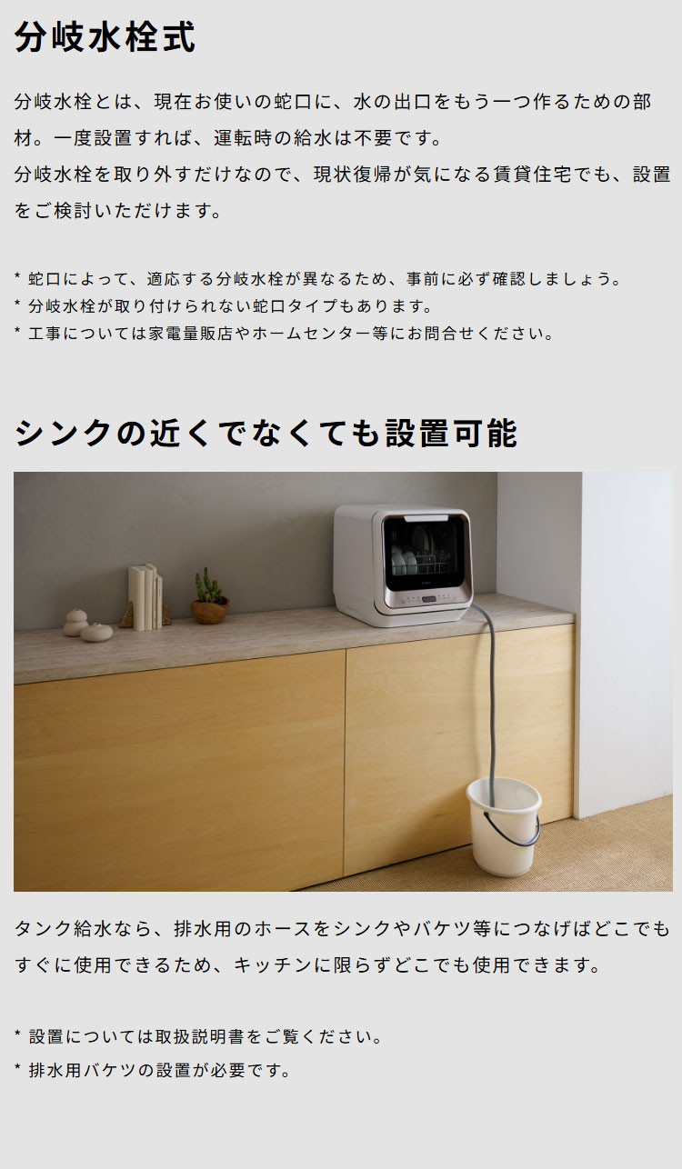 タンク式としてだけでなく、分岐水栓に繋いでも使用できるため、ご家庭の設置環境や状況に合わせて使い分けることが可能です。