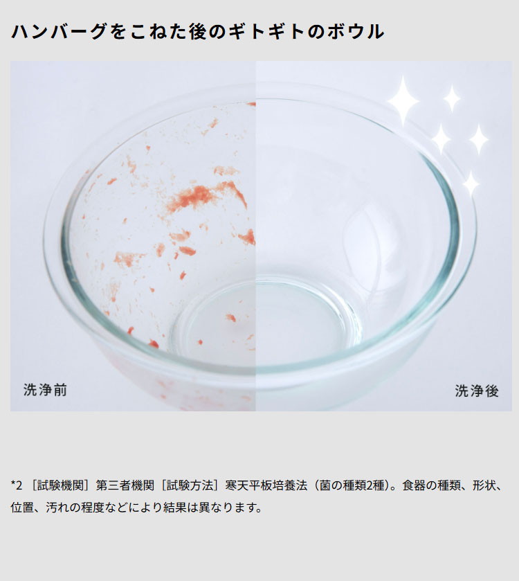 75℃の高温と、約2mに達する高圧水流が、360度あらゆる角度から洗い上げることで、しつこい油汚れもすっきり落とし、同時に99.9%の除菌を実現します。