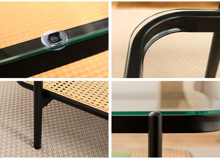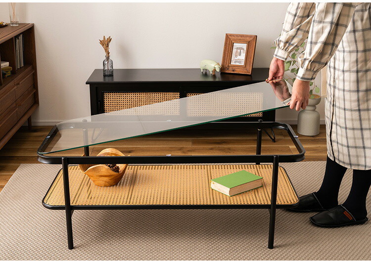 ガラステーブル ラタン 幅110cm リビングテーブル センターテーブル 籐 透け感 抜け感