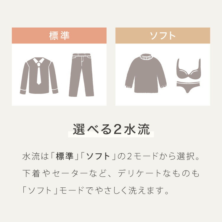 全自動タイプと比べて、水量・時間・モードの自由な調整が可能で、効率的かつ無駄のない運転が実現できます。洗剤がムラなく溶けやすい設計で、粉末洗剤でも残りカスが少なく衣類に優しいです。